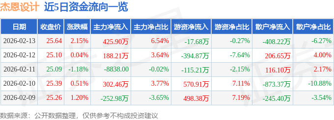 证券之星消息,截至2026年2月13日收盘,杰恩设计(300668)报收于25.64元,上涨2.15%,换手率2.56%,成交量2.55万手,成交额6512.82万元。